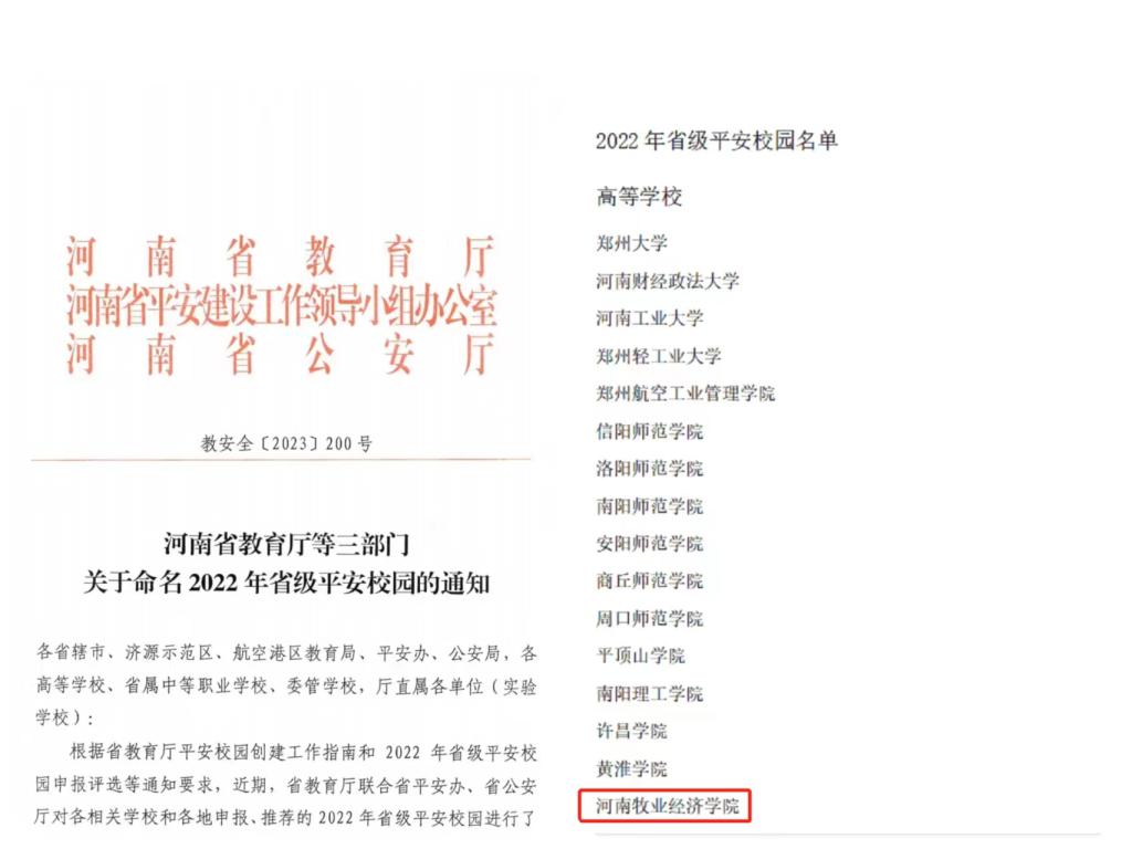 近日,河南省教育厅、河南省平安建设工作领导小组办公室、河南省公安厅联合下发《河南省教育厅等三部门关于命名2022年省级平安校园的通知》(教安全〔2023〕200号文),完美官网被命名“2022年省级平安校园”,有效期三年。