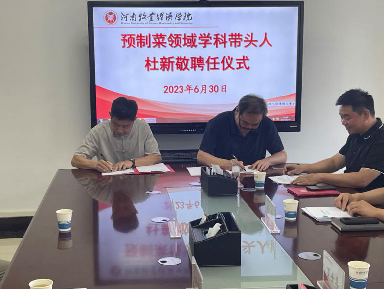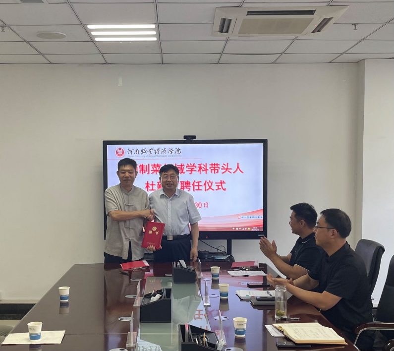 罗士喜代表学校对杜新敬受聘学校预制菜学科带头人表示热烈的欢迎和衷心的感谢。他指出,柔性引进学科带头人是学校加强学科建设和师资队伍建设的一项重要举措。杜新敬表示,将充分利用好学校提供的平台,认真履行学科带头人岗位职责,积极发挥自己在豫菜烹饪领域的优势,与学校学科团队一道,提升预制菜领域学科实力,为河南省预制菜及地方特色菜肴的工业化转化贡献自己的力量。