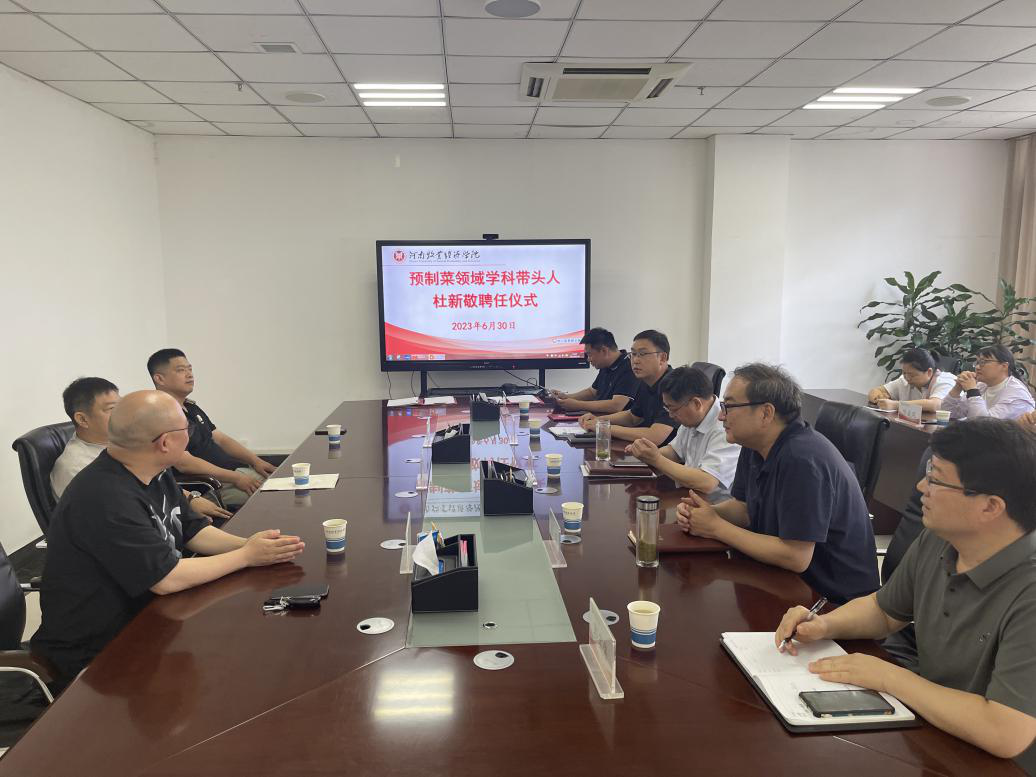 为进一步深入贯彻人才强校战略,加快学校预制菜领域学科的建设步伐,近日,预制菜领域学科带头人杜新敬的聘任仪式在龙子湖校区图书馆810会议室举行。校长罗士喜、副校长张伟出席会议,人事处处长柴华,食品与生物工程学院领导班子和专业教师代表参加了会议。聘任仪式由食品与生物工程学院院长邹建主持。