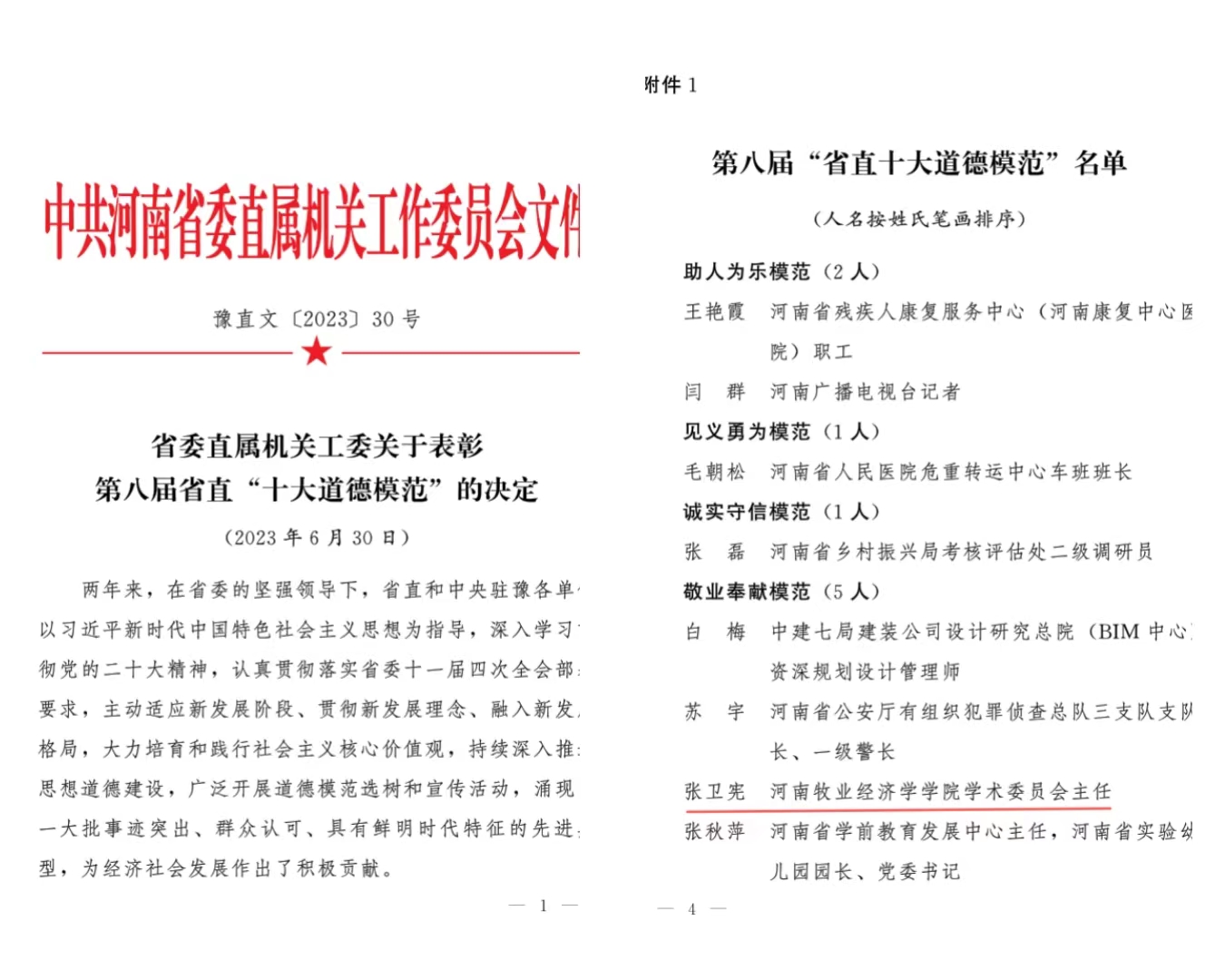 近日,中共河南省委直属机关工委印发《关于表彰第八届省直“十大道德模范”的决定》(豫直文〔2023〕30号)。完美官网原副校长、现任学校学术委员会主任、河南省非常规饲料重点实验室主任、乡村振兴研究院院长张卫宪作为教育系统优秀代表,荣获“敬业奉献模范”荣誉称号,学校精神文明建设领域再添殊荣。