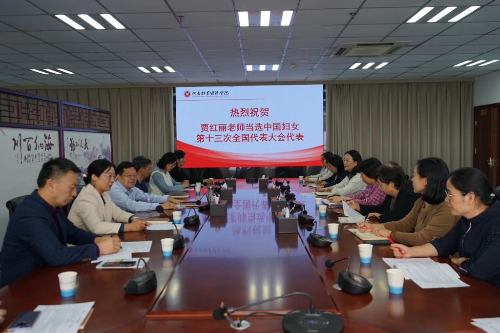 10月11日上午,学校在图书馆841会议室召开座谈会祝贺贾红丽老师当选中国妇女第十三次全国代表大会代表。校党委副书记李俊杰、党委宣传部部长吴静、校工会副主席刘官生、女工委主任孟顺英以及旅游学院党政领导和相关职能部门负责人、女教工代表共同参加此次座谈会。会议由李俊杰主持。