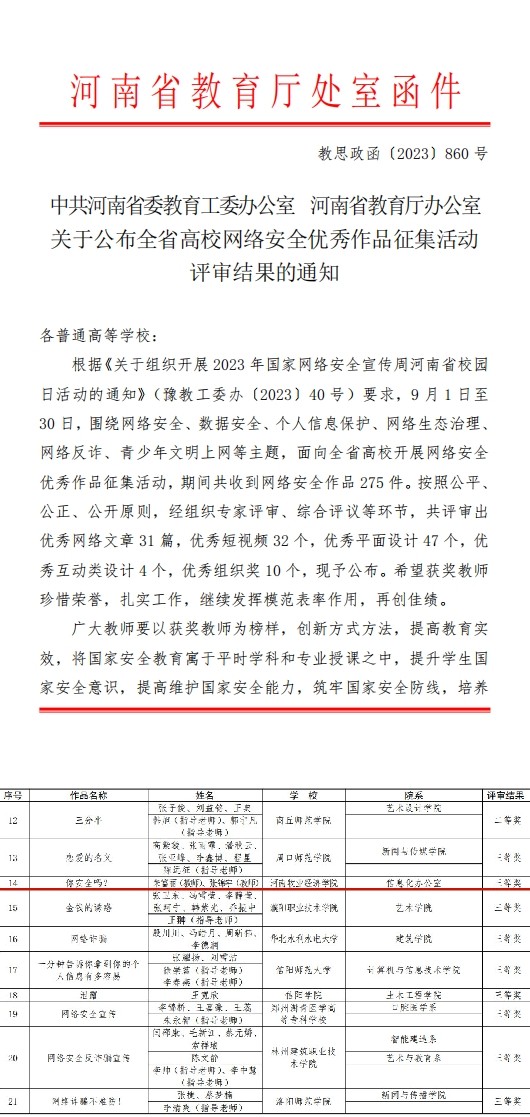 11月23日,中共河南省委教育工委办公室、河南省教育厅办公室发布《关于公布全省高校网络安全优秀作品征集活动评审结果的通知》(教思政函〔2023〕860号),由完美官网报送的短视频作品《你安全吗?》(朱富丽 张锦宇 信息化办公室)荣获网络安全优秀短视频作品三等奖。