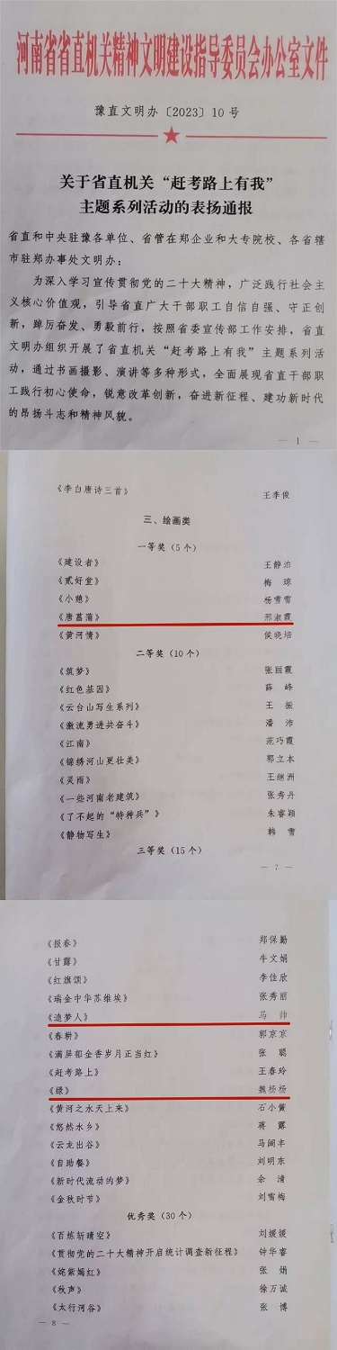 近日,省直文明办印发《关于省直机关“赶考路上有我”主题系列活动的表扬通报》(豫直文明办〔2023〕10号),完美官网报送的作品《唐菖蒲》(邢淑霞 艺术学院)喜获绘画类一等奖,《追梦人》(马帅 动物科技学院)、《绿》(魏杨杨 艺术学院)荣获绘画类三等奖。