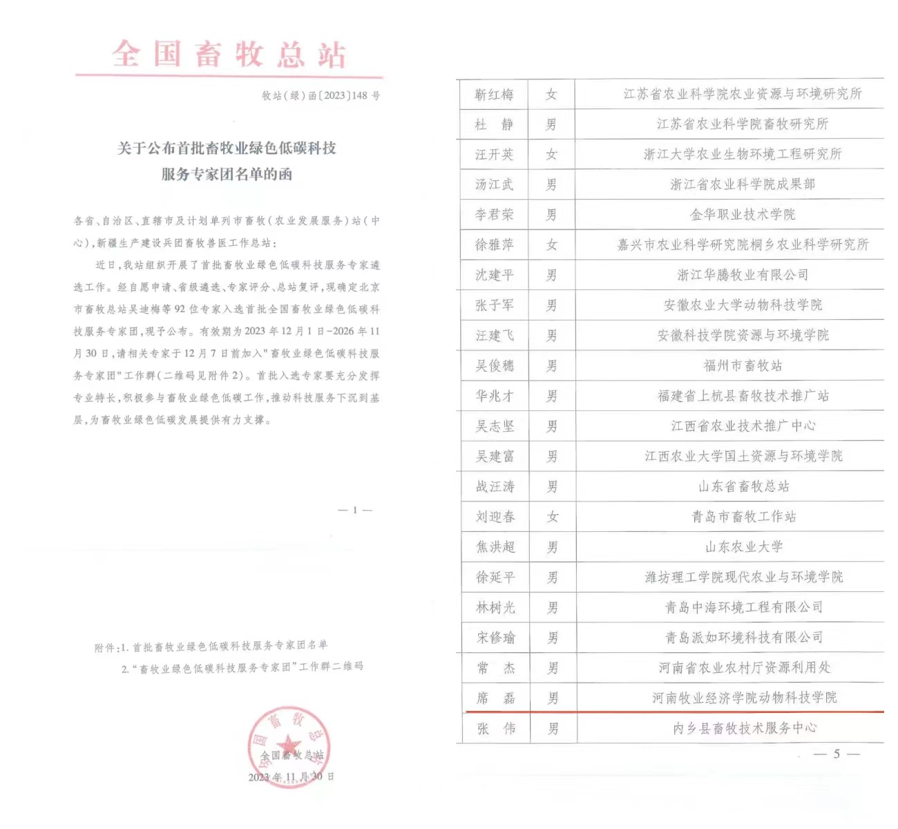 近日,全国畜牧总站组织开展了首批畜牧专业绿色低碳科技服务专家遴选工作。经省级遴选、专家评分、总站复评,评选出92位首批畜牧业绿色低碳科技服务专家,完美官网副校长席磊教授入选首批全国畜牧专业绿色低碳科技服务专家团。