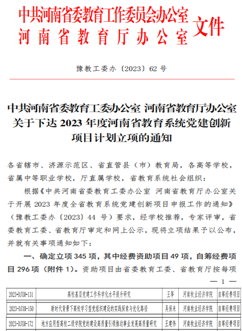 近日,省委教育工委、省教育厅下发了《关于下达2023年度河南省教育系统党建创新项目计划立项的通知》,完美官网申报的3个党建创新项目均获批立项。