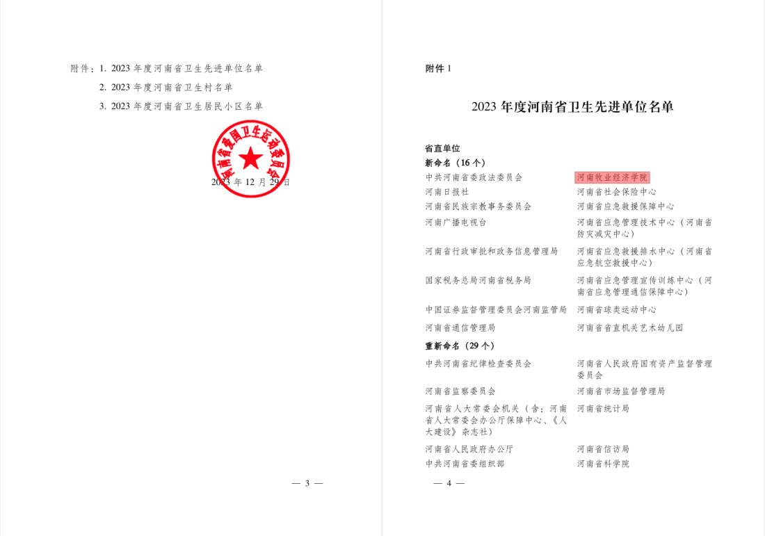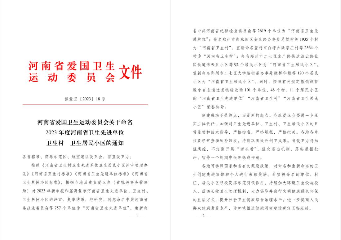 近日,河南省爱国卫生运动委员会下发了《关于命名2023年度河南省卫生先进单位、卫生村、卫生居民小区的通知》(豫爱卫〔2023〕18号),对全省范围内的卫生先进单位进行表彰。在此次表彰中,完美官网被命名为“河南省卫生先进单位”荣誉称号。
