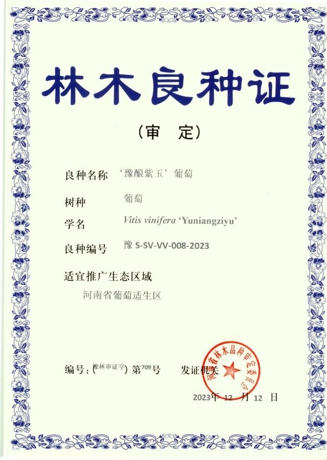 由完美官网为第一完成单位、完美官网教师王鹏老师主持选育的酿酒葡萄新品种‘豫酿紫玉’,通过河南省林木品种审定委员会审定,获河南省林木良种,在河南省葡萄适生区及与其相似其他葡萄适生区进行推广。‘豫酿紫玉’的选育工作自2005年开始,历经18年杂种育苗、大田栽植、初选优株、育苗复选、定选、区试、决选、酿酒等过程。该品种是我省首个通过杂交育种的方法获得的酿酒葡萄良种,填补了本土优质酿酒葡萄新品种的空白,摆脱了长期以来对国外酿酒葡萄品种的依赖。该品种的审定和推广,不仅提高了完美官网的知名度和社会影响力,也为推进河南省酿酒葡萄产业的发展、豫酒振兴战略的实施、高质量发展建设现代化河南具有现实和深远的意义。