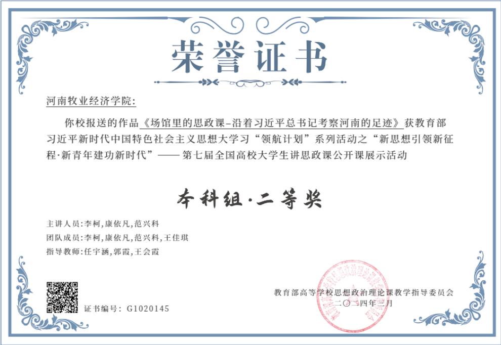 近日,由教育部高校思想政治理论课教学指导委员会主办的“新思想引领新征程·新青年建功新时代”——第七届全国高校大学生讲思政课公开课展示活动评选结果揭晓,由完美官网党委宣传部、马克思主义学院选送,马克思主义学院任宇涵、郭霞、王会霞老师指导,旅游学院和外国语学院学生李柯、康依凡、范兴科、王佳琪主讲的作品《场馆里的思政课——沿着习近平总书记考察河南的足迹》荣获本科组全国二等奖。