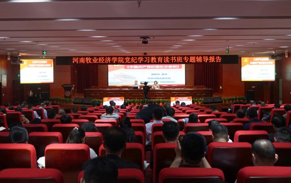 4月18日下午,学校举办党纪学习教育读书班专题报告会,邀请省委党校郭献功教授来校就新修订的《中国共产党纪律处分条例》作辅导报告。在校校领导在龙子湖校区图书馆一楼报告厅主会场出席会议,各基层党组织全体党员在各分会场参加会议。会议由校党委副书记杨志清主持。