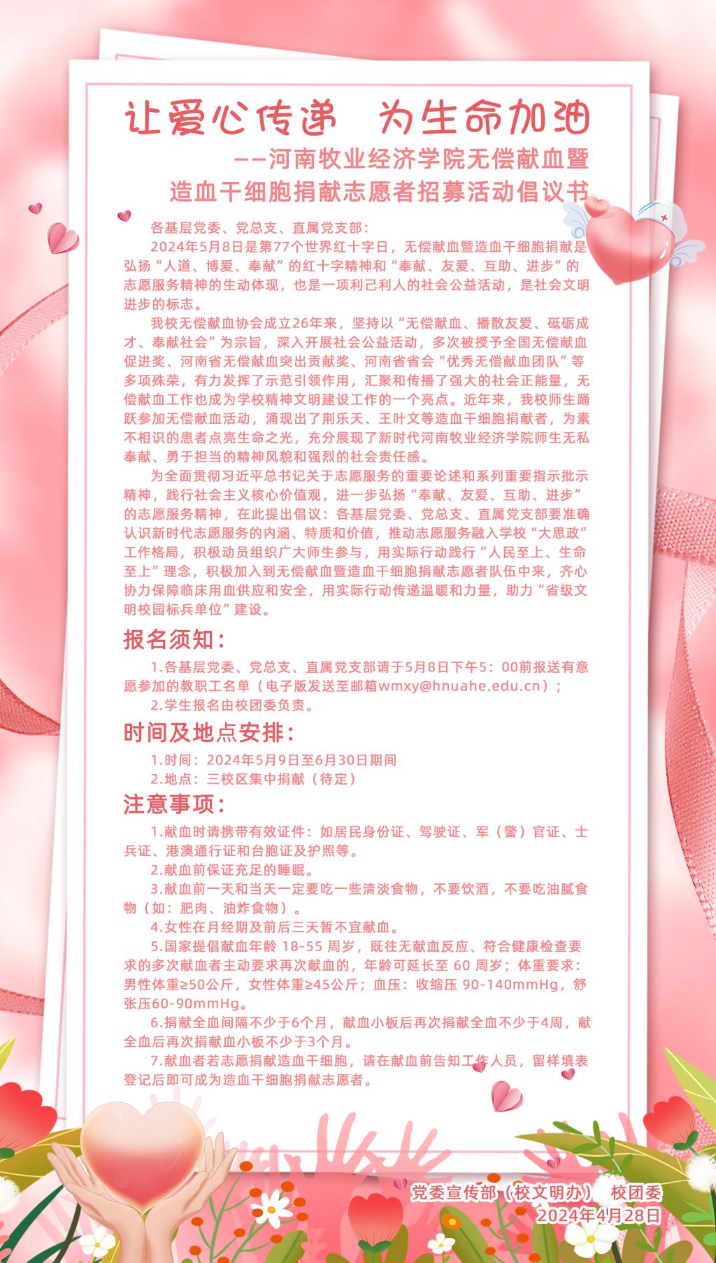 让爱心传递 为生命加油 —— 完美体育官方网站无偿献血暨造血干细胞捐献志愿者招募活动倡议书