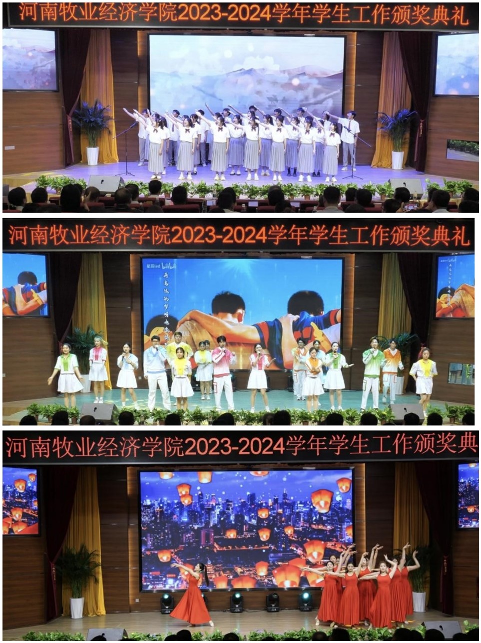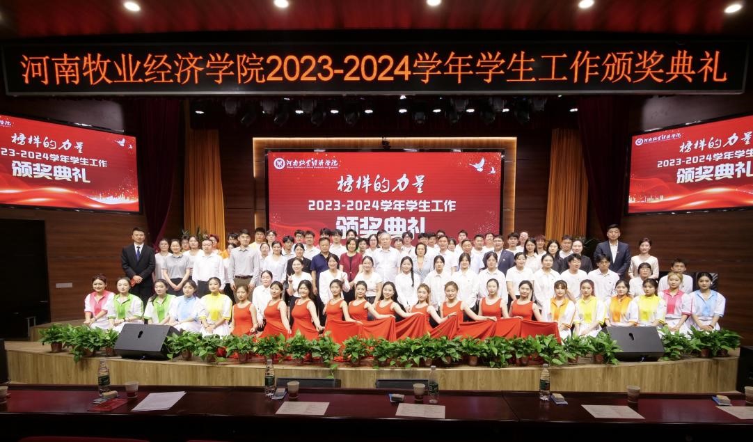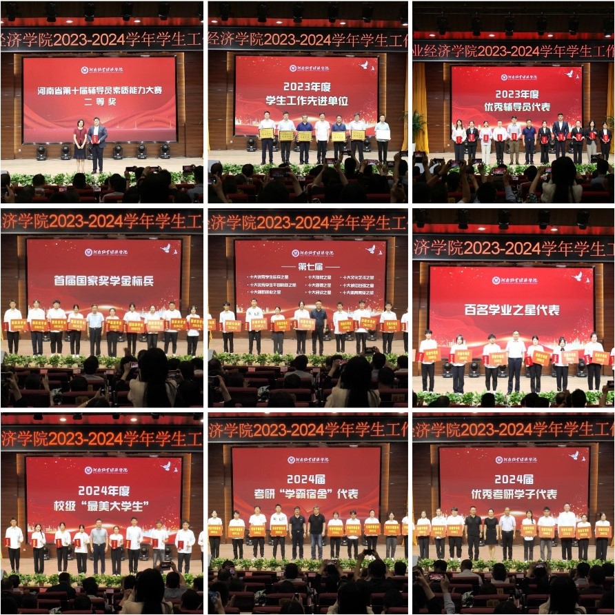 与会领导分别为河南省首批国防教育模范高校获奖单位、河南省“大美学工”十佳学生工作品牌获奖单位、河南省第十届辅导员素质能力大赛二等奖获得者、2023年度学生工作先进单位、2023年度优秀辅导员代表、首届国家奖学金标兵、第七届校级学生专项奖获及百名学业之星获奖代表、2024年度校级“最美大学生”、2024年硕士研究生考试“学霸宿舍”代表、2024届优秀考研学子代表颁奖并合影留念。
