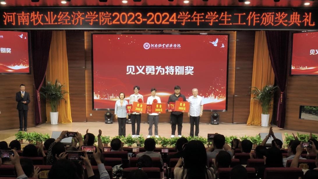 英雄出自少年,伟大出自平凡。在本次颁奖典礼的特别环节,校党委书记穆瑞杰、校长尹新明分别为动物科技学院刘浩东、袁志杰,国际教育学院刘昊三名同学颁发见义勇为特别奖。刘浩东、袁志杰同学在面对老师突发疾病的紧急情况下,勇敢果断、沉着冷静,把握黄金救援时间挽救了他人生命;刘昊同学面对凌晨的突发紧急情况,为维护他人的生命财产安全,不顾个人安危,挺身而出,徒手夺刀。他们展现出的高尚品德和勇敢精神,抒写了新时代青年大学生贡献社会的情怀和担当,为全校学生树立了标杆和榜样。