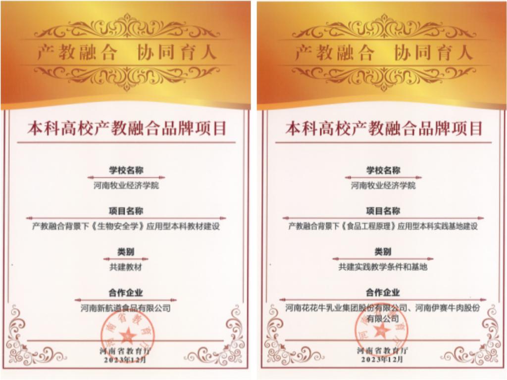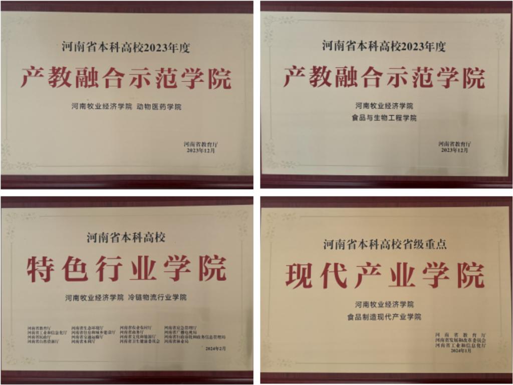 大会为河南省第二批省级特色行业学院、产教融合品牌项目授牌或颁证。完美官网食品与生物工程学院、动物医药学院被授予河南省本科高校2023年度产教融合示范学院,冷链物流行业学院被授予河南省本科高校特色行业学院,食品制造现代产业学院被授予河南省本科高校省级重点现代产业学院。产教融合背景下《食品工程原理》应用型本科实践基地建设获得本科高校产教融合品牌项目,产教融合背景下《生物安全学》应用型本科教材建设获得本科高校产教融合品牌项目。