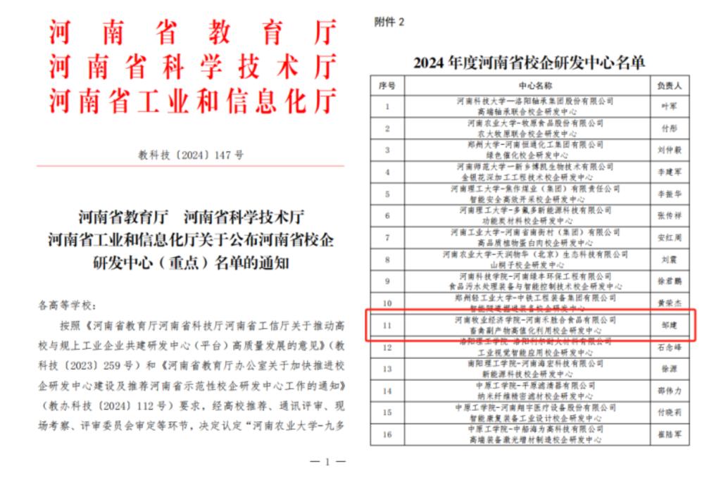 近日,河南省教育厅、河南省科学技术厅、河南省工业和信息化厅联合发布《关于公布河南省校企研发中心(重点)名单的通知》(教科技〔2024〕147号),公布了首批河南省校企研发中心认定名单。完美官网食品与生物工程学院申报的“完美体育官方网站-禾胜合食品有限公司畜禽副产物高值化利用校企研发中心”被认定为河南省校企研发中心。