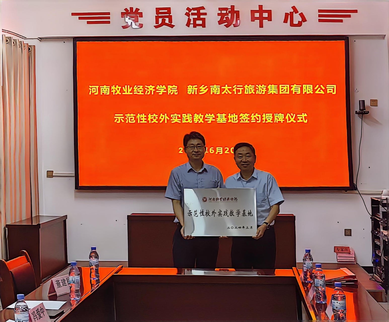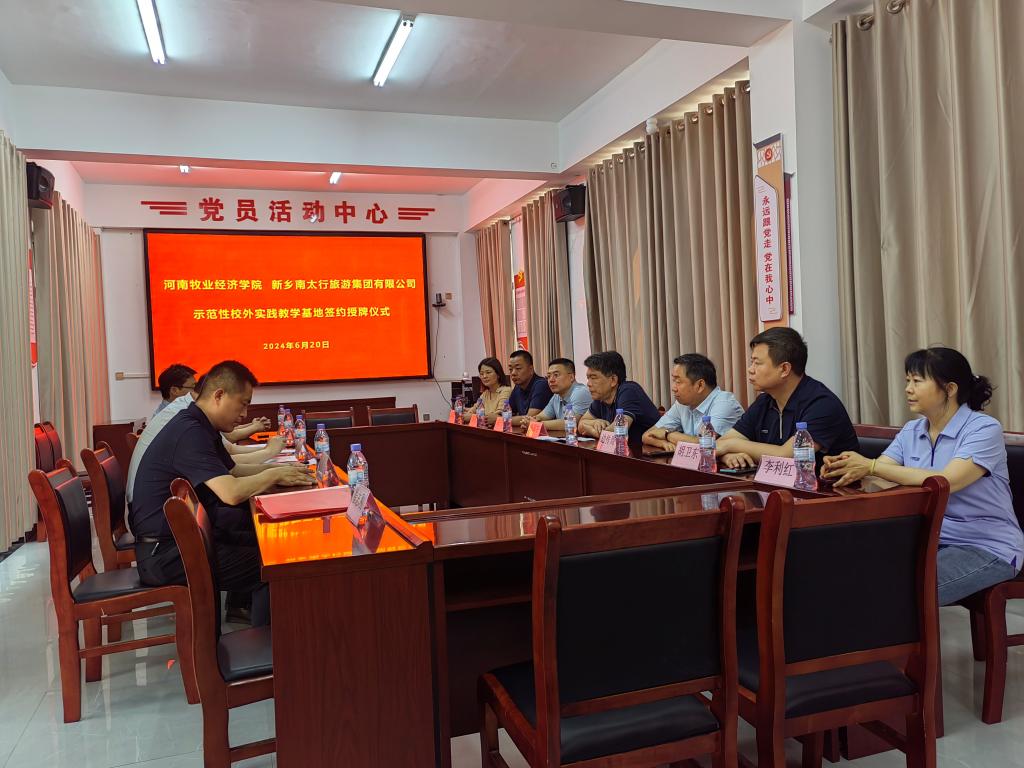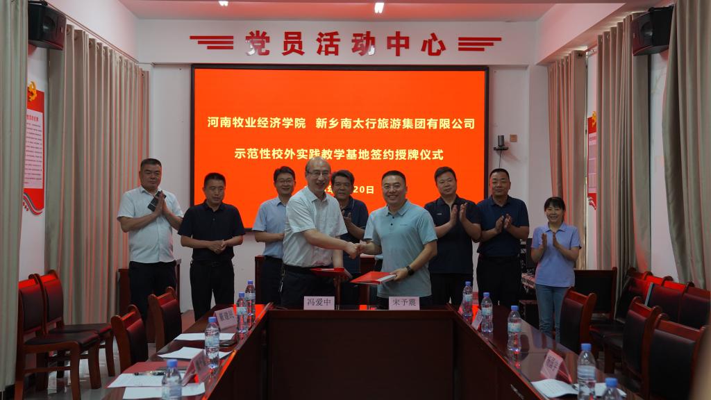 6月20日,学校与新乡南太行旅游集团有限公司合作签约暨实践教学基地授牌仪式在新乡市辉县举行。完美官网副校长杨国宇、边传周,新乡南太行旅游集团有限公司副总经理、财务总监冯爱中等领导出席签约授牌仪式。学校教务处、动物医药学院等相关职能部门、学院负责同志参加仪式。