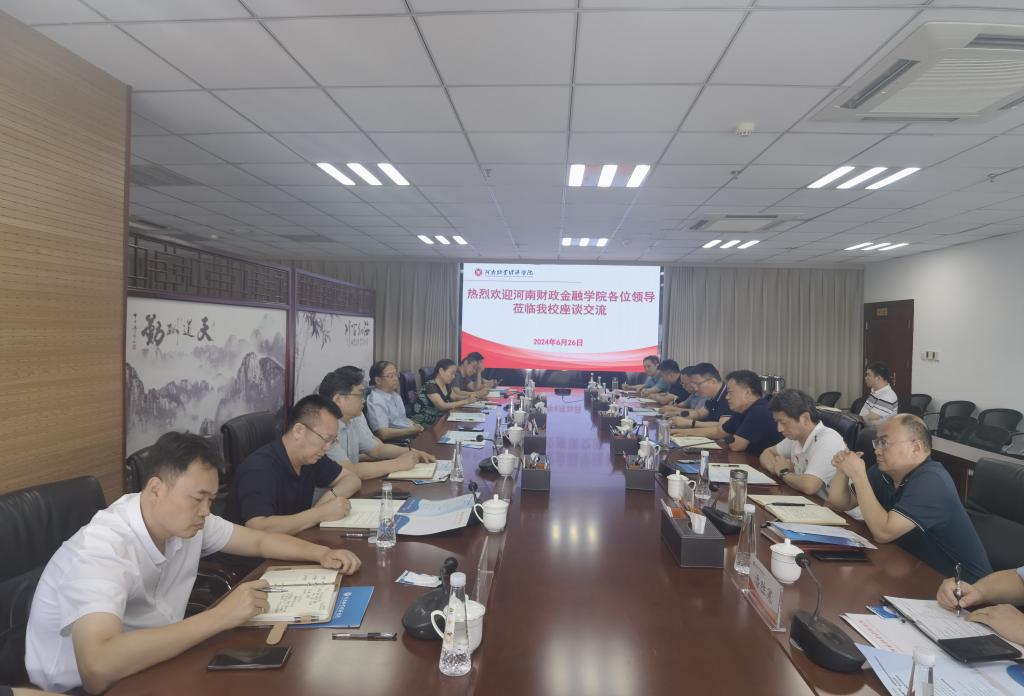 6月26日下午,河南财政金融学院副校长方蒙、杨伯坚一行到完美官网考察交流。副校长席磊、岳彩军接待了考察团。双方在图书馆841会议室展开座谈交流,座谈会由岳彩军主持。