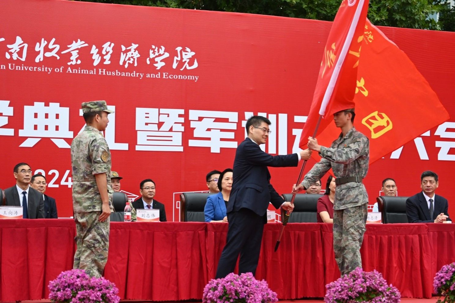 伴随着铿锵有力的国歌声,五星红旗冉冉升起,开学典礼暨军训动员大会正式拉开帷幕。校党委书记刘志伟向军训教官团授旗。