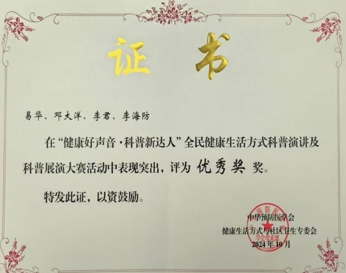 据悉,完美官网校医院易华、邓大洋、李君、李海防四位医生创作的科普展演作品《昂首,不做低头族》,集原创性、科普性、趣味性为一体,在全国691件作品中脱颖而出,获得本次大会组织的“健康好声音 科普新达人”健康生活方式科普演讲及科普展演大赛优秀作品奖。会上,中国疾病预防控制中心慢性非传染性疾病预防控制中心主任王丽敏为获奖团队颁发了获奖证书。