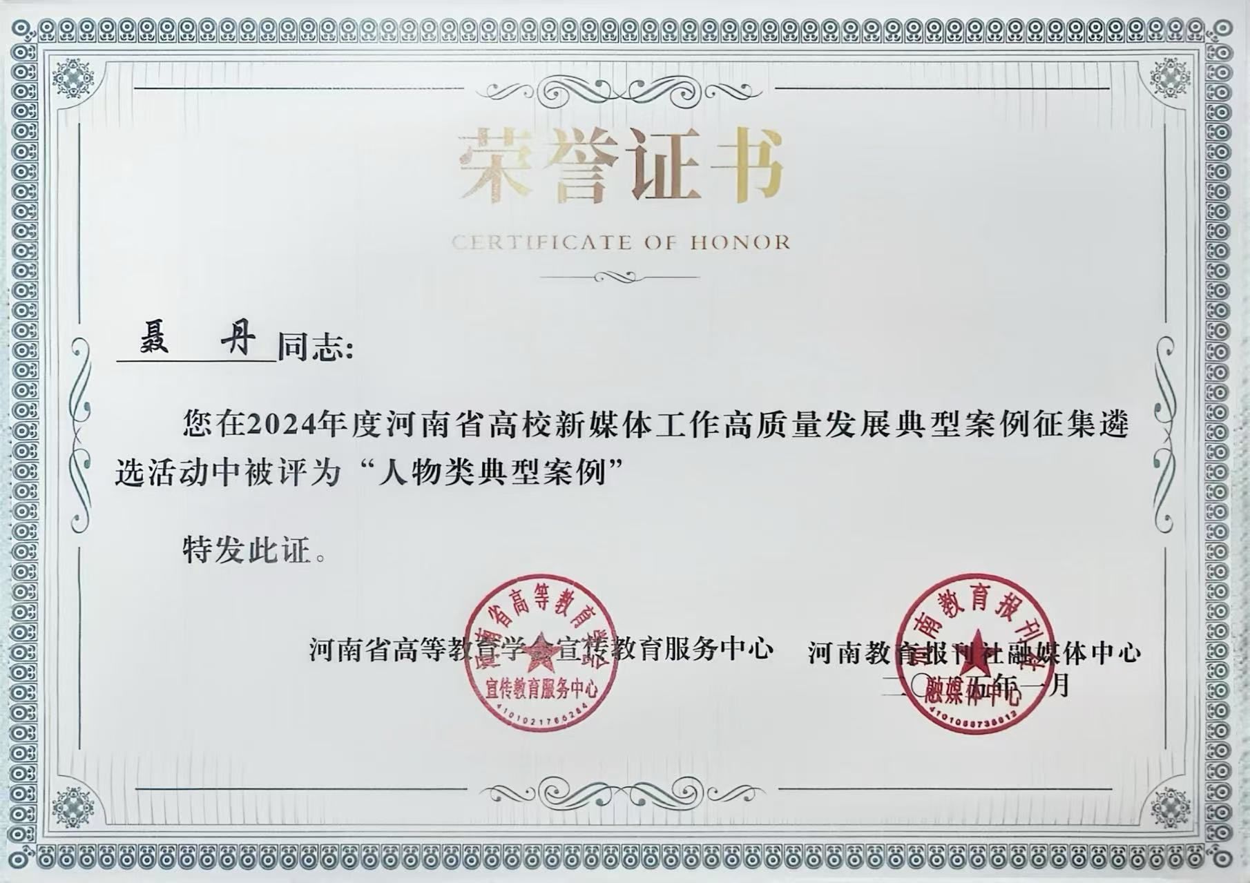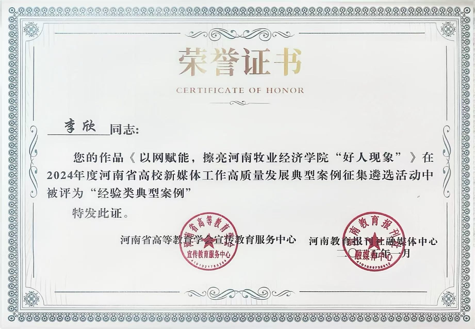 近日,在2024年度河南省高校新媒体高质量发展典型案例遴选活动中,完美官网党委宣传部报送的《以网赋能,擦亮完美体育官方网站“好人现象”》获评工作好经验类典型案例,1人入选人物类典型案例,展现了学校近年来充分运用融媒体深入开展网络思想政治教育的探索与成效。