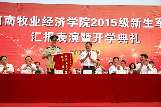 党委书记王保国代表学校为承训部队赠送锦旗。党委副书记、副校长曾照烨在部队教官的陪同下检阅了新生军训方阵。“同学们好!”“同学们辛苦了!”,这声声问候,同学们如沐春风;“校长好!”“为学校争光”,这铿锵有力的口号,回荡校园。副校长许圣道宣读了《关于表彰2015级新生军训先进方阵和先进个人的决定》,决定授予动物科技学院畜牧兽医1班等41个方队为“2015级新生军训先进方阵”,李岩岩等583名同学为“2015级新生军训先进个人”。学校领导和部队首长为获奖的集体和个人颁奖。
