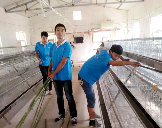 科技110 的队员对鸡群转群后的鸡笼进行检查检修