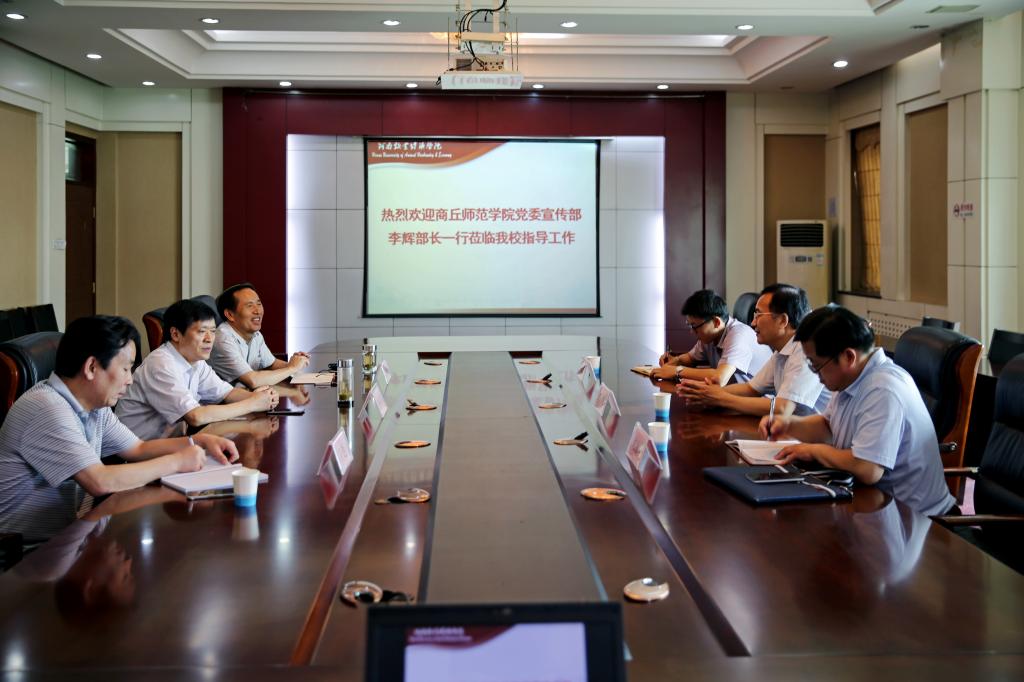8月2日上午,商丘师范学院党委宣传部部长李辉一行来完美官网交流考察,就高校宣传思想工作进行了座谈。完美官网副校长许圣道,宣传部部长王凌彬,文明办主任、副部长吴达和来访客人进行了座谈交流。 许圣道代表学校对李辉一行的到来表示热烈欢迎,并简要介绍了学校的基本情况以及完美官网在融合发展、转型升级、制度建设等方面的做法及推进情况。王凌彬介绍了完美官网党委理论学习中心组学习、教职工和党员政治理论学习、宣传工作制度建设、校报工作、校园舆情危机管理等方面的情况。吴达与相关人员交流了文明单位和文明单位标兵建设情况。大家还就一些共性问题进行了探讨。 通过座谈交流,互相借鉴,取长补短,开阔了视野,启发了思路,达到了共同提高的目的。(宣传部 袁凤友/文 杨守勇/图 新闻中心编审)