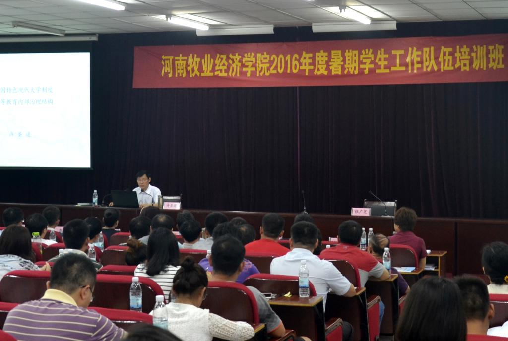 在培训中,许圣道为各院系学生工作负责人和培训班全体学员员做了“学生工作干部在高校内部治理体系中的地位与作用”的专题报告。他从欧美大学内部治理模式的演变、国内大学内部治理结构的沿革、现代大学制度下内部治理体系的完善与治理能力的提升以及学生工作干部在学校内部治理体系中的地位与作用等方面进行了精彩的讲解。