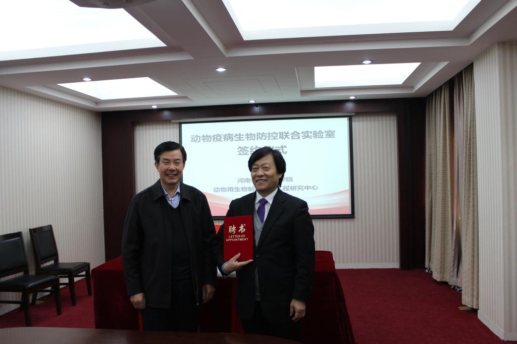 李明中和王云峰分别致辞,并代表双方签署了共建“动物疫病生物防控联合实验室”框架协议书,进行了联合实验室揭牌。同时,李明中为王云峰研究员和崔现兰博士颁发了特聘教授证书。