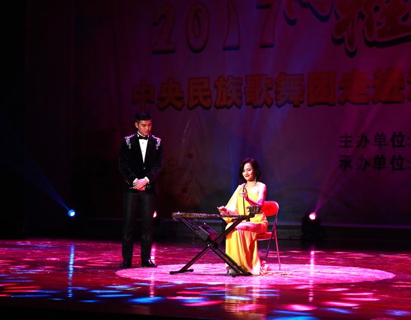 伴随着欢快的音乐,舞蹈《快乐舞步》拉开了本场演出的帷幕,几十位艺术家身着民族盛装闪亮登场,热烈欢快的舞蹈瞬间点燃了观众的热情。在一个半小时的演出中,中央民族歌舞团的艺术家们倾情演出,张铎的马头琴独奏《万马奔腾》引人入胜,琴声时而悠扬,时而刚劲;沈利、朱韬带来的女声独唱《编花篮》、《一杯美酒》等歌曲,使观众再一次重温经典,赢得掌声不断;哈尼族木履舞蹈《山谷回响》、塔吉克族舞蹈《阳光洒满帕米尔》,展现了少数民族艺术的别样魅力;二月半组合的《谢谢侬》、《悟空》给大家带来了欢快的流行音乐体验;女子十二坊成员雷滢演奏的独弦琴《贝加尔湖畔》优雅温婉,赵雄、王帅的笛子与琵琶合奏《卷珠帘、少林少林》节奏悦耳,给观众留下了深刻印象;朝鲜族男高音歌唱家、国家一级演员蓝剑倾情演绎的《互相帮助》、《在那桃花盛开的地方》《万丈高楼平地起》等民歌,传递着满满正能量。