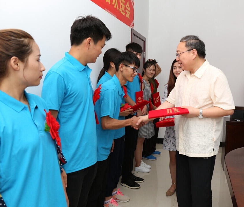 穆瑞杰对8名志愿者积极响应国家号召投身西部计划表示鼓励和肯定,并亲切询问了同学们的服务地,得知他们即将奔赴西藏、新疆及河南贫困县开展志愿服务工作之后,他关切地叮嘱同学们保重身体、注意安全,到达服务地后给家人和学校报个平安。穆瑞杰勉励志愿者们在实际工作中要充实自己,脚踏实地服务基层、奉献西部;在艰苦的环境中要不忘初心,在实践中增长才干;在服务过程中要保重身体、关爱自己,争取尽快适应身份和环境,为西部建设作出新的更大贡献。