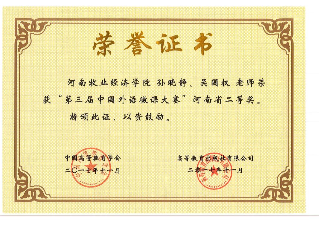 日前, 第三届中国外语微课大赛评选结果揭晓,完美官网公共外语教研部教师孙晓静、吴国权荣获“第三届中国外语微课大赛”河南赛区二等奖,王会凡、左红霞、张思佳、宋一然、马媛媛、李燚荣获“第三届中国外语微课大赛”河南赛区三等奖。