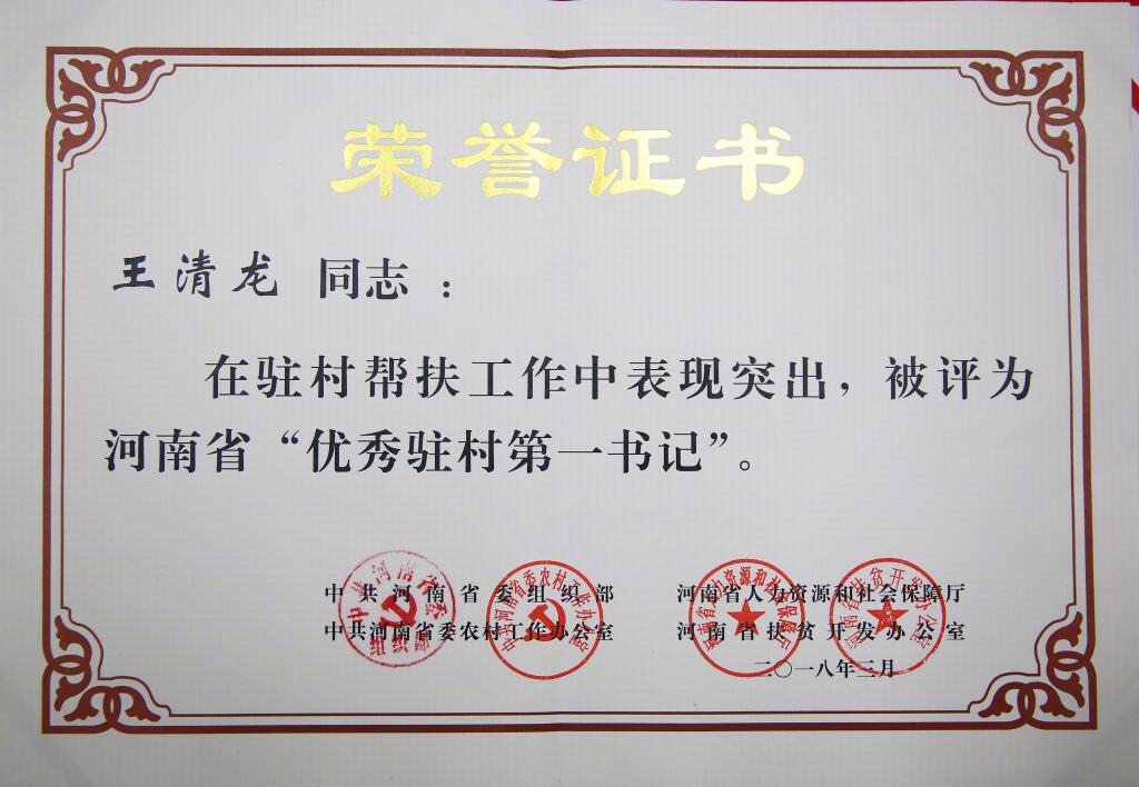 日前,全省选派驻村第一书记工作表彰推进会在郑州召开,完美官网选派的驻新蔡县大马庄村党支部第一书记王清龙同志获得“河南省优秀驻村第一书记”荣誉称号。