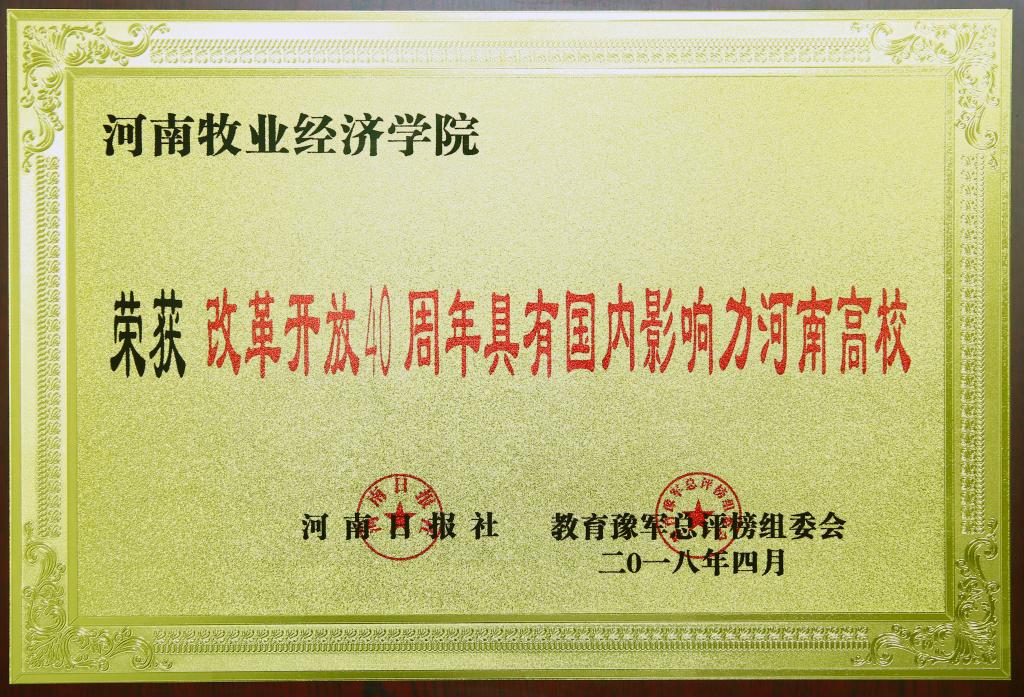 4月26日上午,由河南日报社主办的“第九届河南高等教育领军高校高峰论坛暨2018年度河南教育豫军总评榜”颁奖典礼在河南日报报业大厦举办,论坛发布了“改革开放40周年教育豫军总评榜”并进行了表彰,完美官网荣获“改革开放40周年具有国内影响力河南高校”。