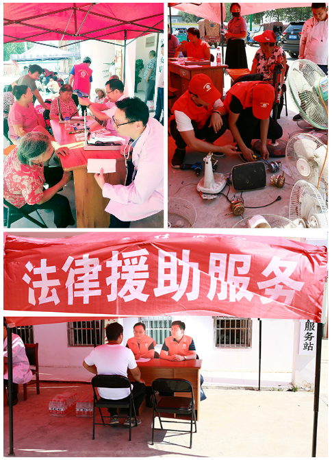 与此同时,学校志愿服务队在新蔡县大马庄村党群活动中心安营扎寨,开展了紧张有序的志愿服务活动。冒着炎炎烈日,信息工程学院党总支副书记蔡中民带领该院志愿者在不太大的帐篷下,精心为村民修理电磁炉、电饭煲、电风扇、洗衣机、电冰箱等家用电器,大家的衣服都湿透了,水都顾不上喝一口,一直忙到中午,直到最后一件电器修理完毕才收工。医疗卫生志愿服务分队在校医院院长梁天玉的带领下,自带药品和医疗器材设备,在大马庄村村党群活动中心设置了临时就诊点,热情为前来就诊的当地村民进行健康教育和血压血糖、心电图测量、针灸治疗等医疗卫生志愿服务,免费发放解暑降温药品。网络管理中心主任刘建朋等为多媒体教室检修,向当地村民开展网络安全教育,并赠送鼠标和网线等电脑器材。宣传部爱心相册志愿服务分队带着照相器材和设备,热心为村民开展现场照相活动,为村民们留下了一张张幸福的倩影。