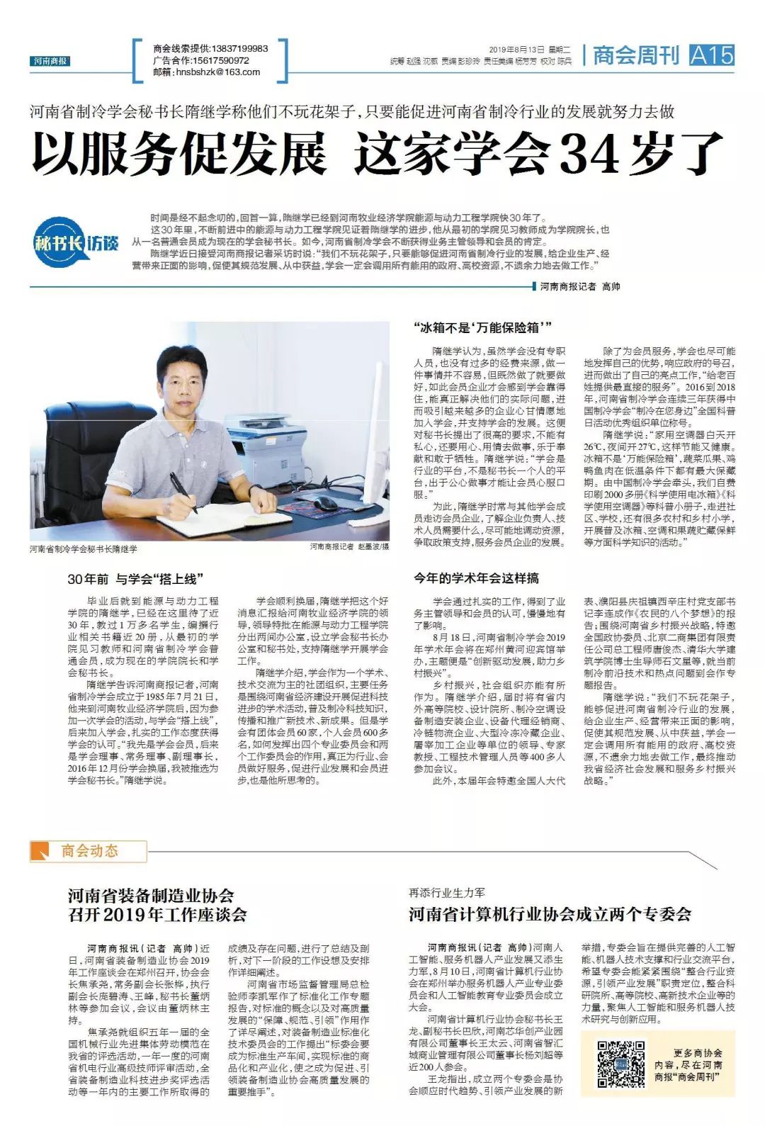 近日,《河南商报》以《以服务促发展 这家学会34岁了》为题报道了完美官网能源与动力工程学院院长兼河南省制冷学会秘书长隋继学在学校的大力支持下,响应政府号召,发挥专业优势,带领学会服务行业发展,促进科技进步等相关事迹。