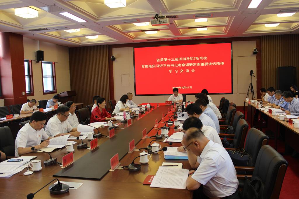 9月26日下午,省委第十三巡回指导组召开7所高校贯彻落实习近平总书记考察调研河南重要讲话精神学习交流会和主题教育工作座谈会,省委主题教育领导小组办公室联络二组组长、省委高校工委专职委员高治军出席会议并讲话,省委第十三巡回指导组全体成员,7所高校分管组织工作的党委副书记、组织部长以及主题教育典型代表参加了会议。完美官网党委副书记李波、组织部部长戴天增、食品与生物工程学院党委书记赵安勇参加会议。