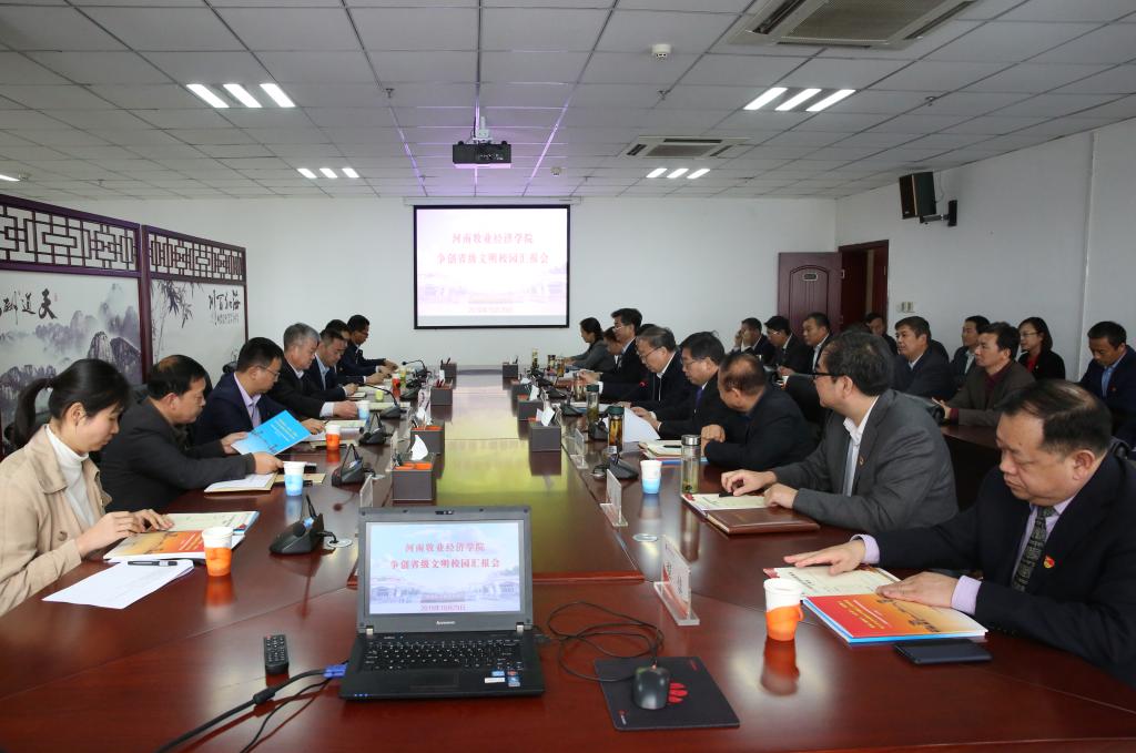 校党委书记穆瑞杰作学校文明校园创建工作汇报。他指出,近年来,学校坚持以习近平新时代中国特色社会主义思想为指导,深入学习贯彻党的十九大精神,增强“四个意识”,坚定“四个自信”,坚决落实“两个维护”,聚焦为党育人、为国育才,突出党的政治建设,紧扣立德树人根本任务,围绕学校中心工作,把省级文明校园创建作为培养高素质人才、提升办学水平、推进高水平应用型大学建设的基础性工作常抓不懈,取得了明显成效。主要体现在七个方面,一是思想道德建设扎实有力、广泛有效;二是领导班子团结坚强有力、勤政廉洁;三是注重教师师德师风建设,社会评价高;四是校园文化丰富多彩、健康向上;五是校园环境整洁优美、和谐有序;六是活动阵地导向正确、育人有效;七是文明校园创建成效显著、组织有力。