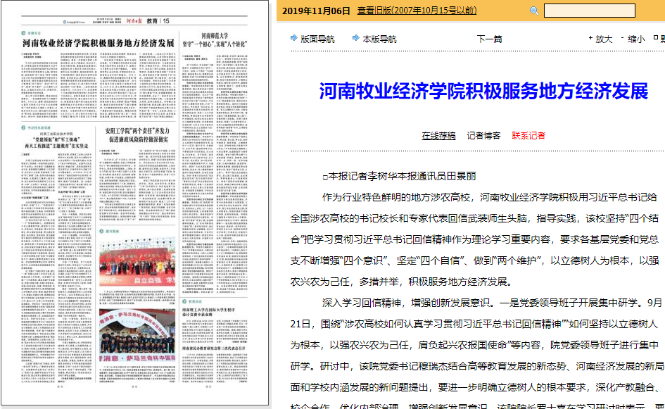 11月6日,《河南日报》以《完美体育官方网站积极服务地方经济发展》为题报道了完美官网积极用习近平总书记给全国涉农高校的书记校长和专家代表回信精神武装师生头脑,指导实践,多措并举,服务地方经济发展相关情况(相关链接:http://newpaper.dahe.cn/hnrb/html/2019-11/06/content_380609.htm)。全文转载如下:
