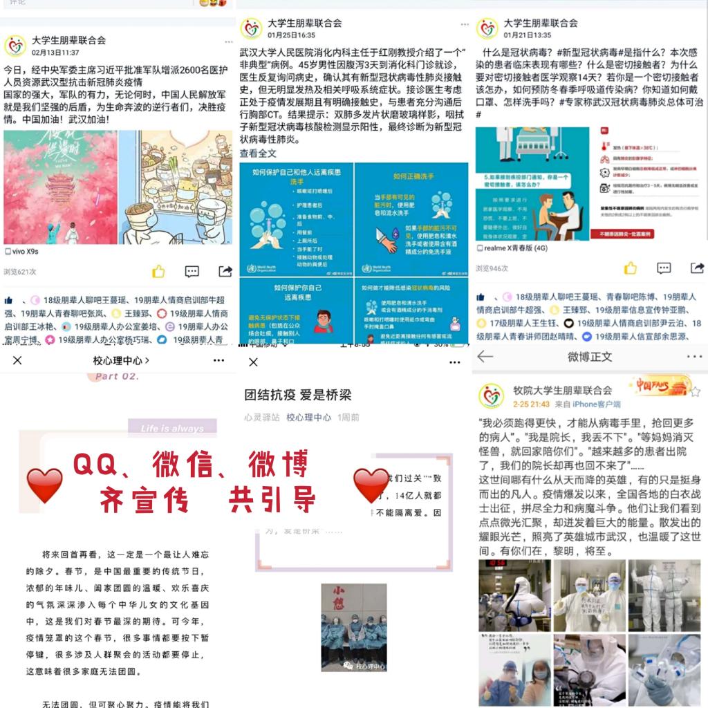 与此同时,为进一步帮助社会公众理解心理规律,依循心理规律,开展心理建设,实现疫情管控阶段的“由心而治”,大学生心理健康教育中心指导学生社团,利用QQ、微博、微信等网络平台,向广大学生宣传科学防护知识,引导树立健康心态;持续推进社会心理服务项目的开展,大学生心理健康教育中心鼓励专业心理咨询人员承担社会心理服务工作,切实用责任之心、仁爱之心、谨慎之心、必胜之心服务师生,服务社会!