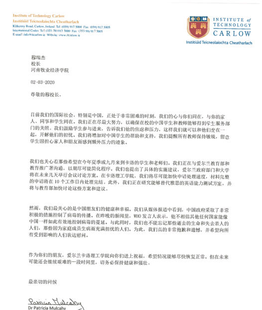 爱尔兰卡洛理工学院校长Dr Patricia Mulcahy在来信中表示,目前国际社会特别是中国正处于新冠肺炎疫情防控非常困难的时刻,我们的心与你们同在,与你的家人、同事和学生同在。爱尔兰卡洛理工学院会尽最大努力,照顾好完美官网在爱尔兰卡洛理工学院留学的学生和研修学习的教师,帮助他们渡过难关。Dr Patricia Mulcahy还表达了对中国政府和人民取得抗击疫情胜利的信心,对中国朋友们的健康和幸福表示关心,并祝愿中国及学校抗击新冠肺炎疫情工作早日取得成功。