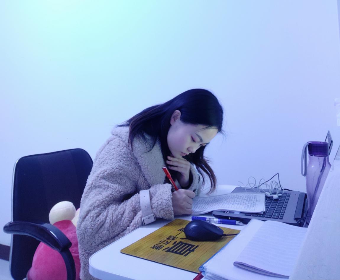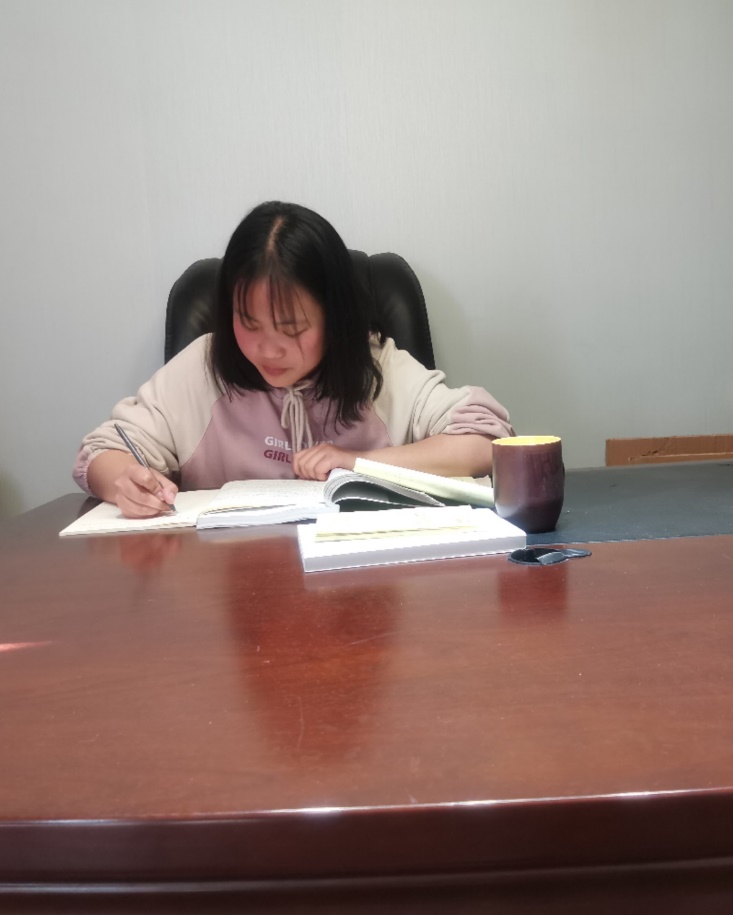 18投资升本(01)班张黎同学,家中没有学习资料,她就上网查询资料再抄到笔记本上“自制”学习资料;楼上的邻居有时在家中跳绳声音嘈杂,她就用响亮的读书声去“感染”他们;为了能像在学校那样有规律的学习,她制定了详细的学习计划来督促自己,并每天严格按照计划表执行,早起读书、学习英语、认真准备考研复试、撰写毕业论文、浏览相关文献期刊……刻苦的她总觉得时间不够用,每天坐在书桌前的时间就长达12个小时。相信张黎同学的勤奋踏实必会迎来硕果累累!