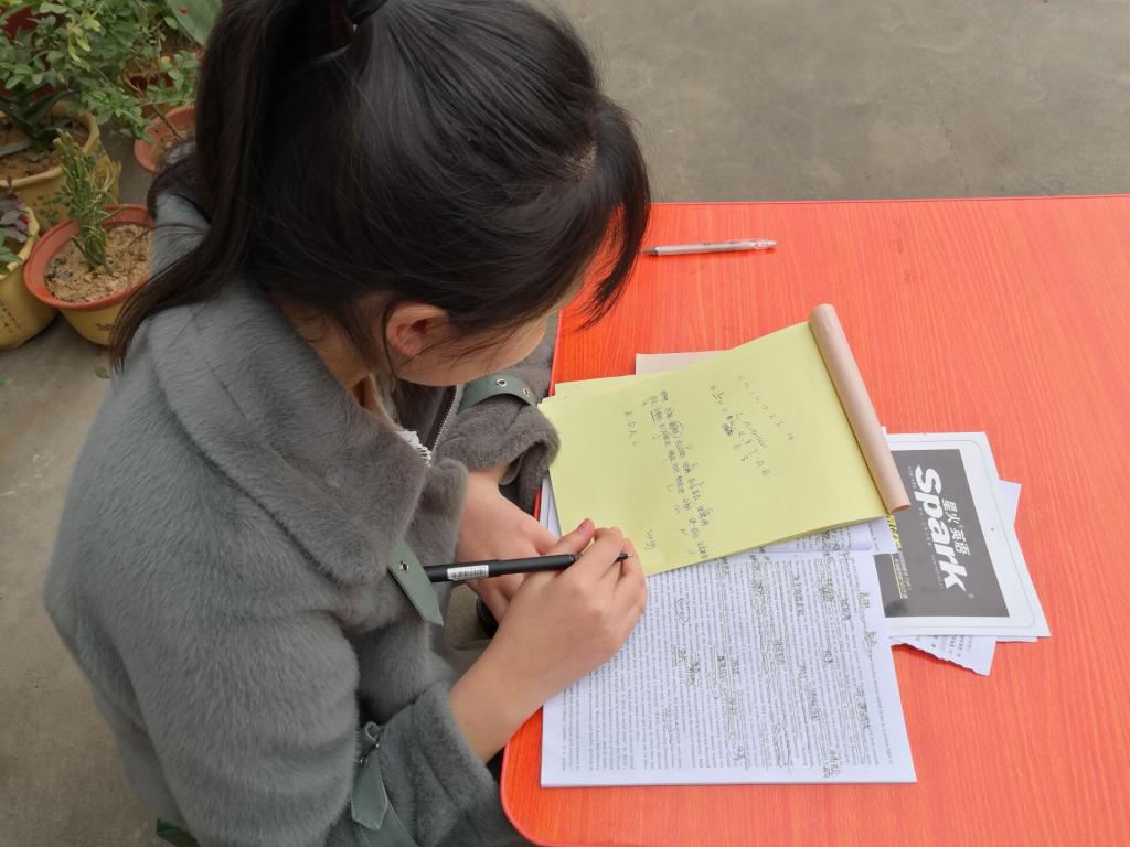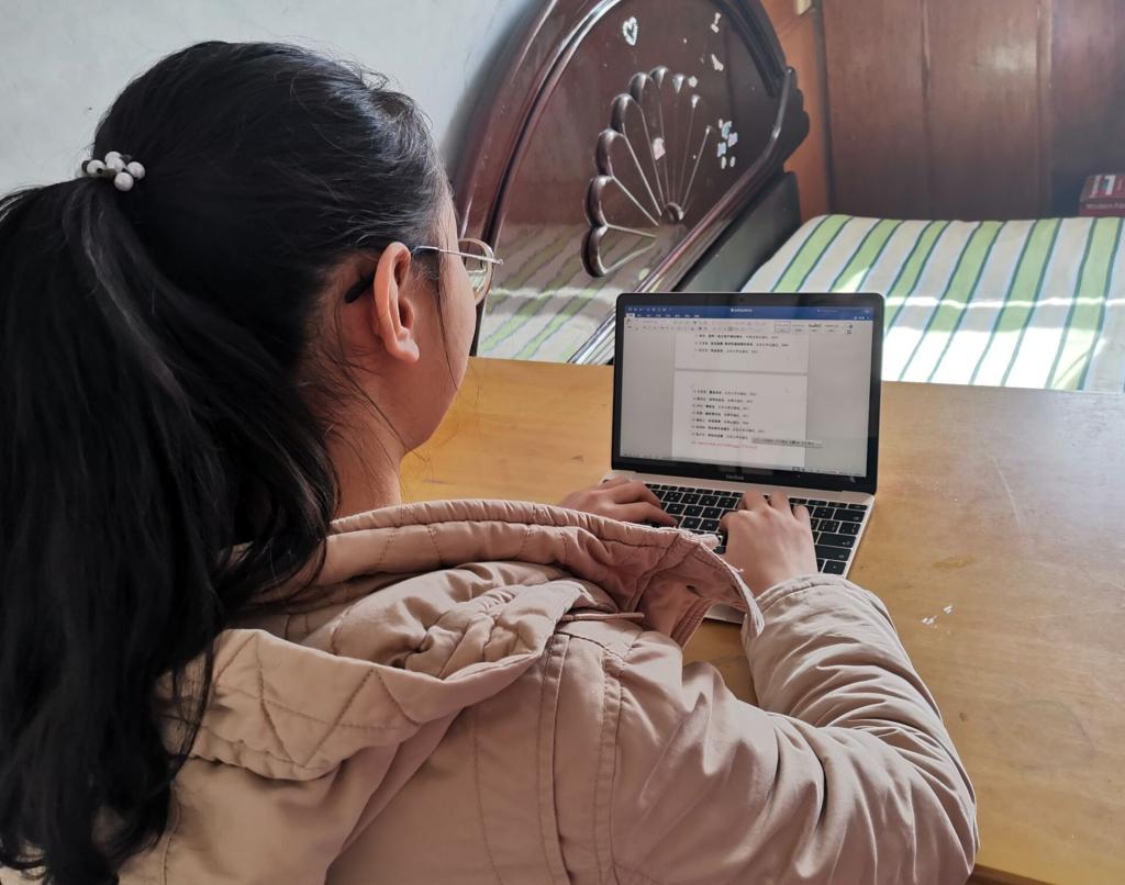 18商英02班的张蕊同学,因为家中未装宽带,手机流量又限速,为了能跟上学习进度,她在每天网络教学直播前就早早搬好凳子坐在自家大门后边,“蹭”邻居家的WiFi听课。春寒料峭,但冻得手脚冰凉的她乐观地认为:这些都不是困难,外在环境的恶劣无法成为她前进路上的绊脚石。