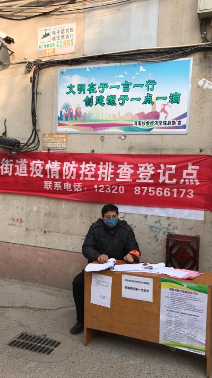 他还担任英才生活区七号楼的楼长,肩负着七号楼的疫情防控任务,他组织门栋长建立信息网络,及时准确上报各类信息,带领大家对无人住户加贴封条,实施对外地返郑人员隔离观察。还定期在生活区门口值班值守工作,工作认真负责,一丝不苟。