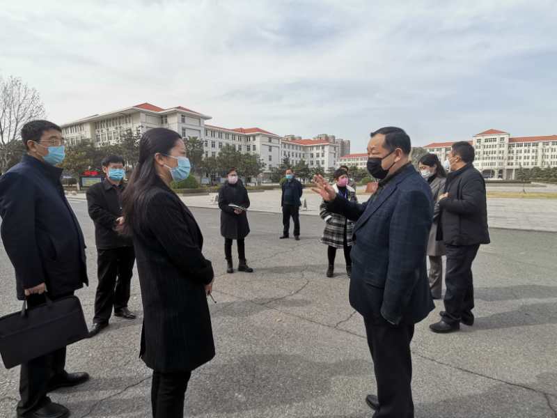 3月11日下午,惠济区教体局副局长崔双丽一行莅临完美官网,检查指导学校疫情防控工作,副校长程慎,院长办公室主任贾江、校医院院长梁天玉、后勤处处长姬道兴、保卫处处长权太举、英才校区综合服务办公室主任王永全等陪同检查。