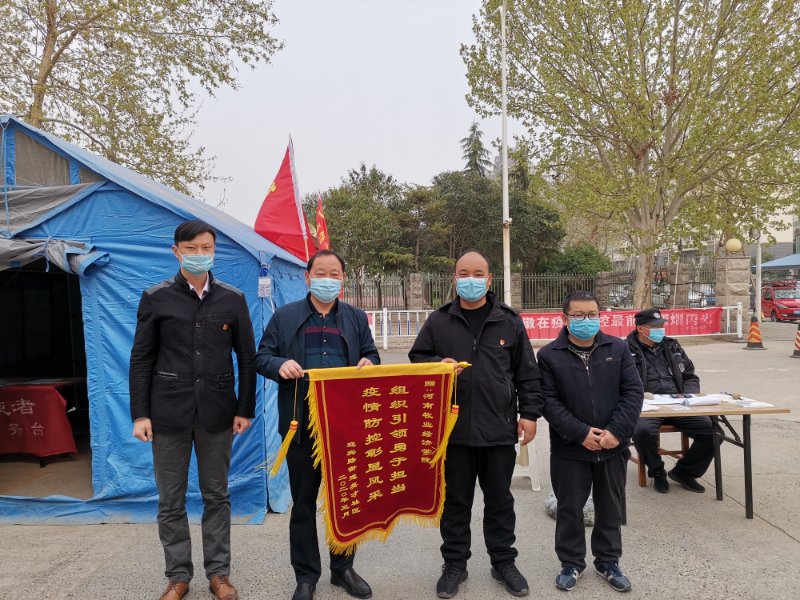 3月31日,惠济区政府迎宾路街道办事处负责人受惠济区政府委托将一面印有“组织引领勇于担当,疫情防控彰显风采”的锦旗送到后勤处处长姬道兴手中,姬道兴接受锦旗并表示感谢