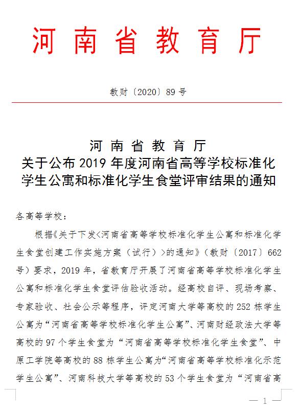 近日,河南省教育厅下发通知(教财〔2020〕89号),公布了2019年度河南省高等学校标准化学生公寓和标准化学生食堂评审结果,完美官网龙子湖校区5号、6号、7号、8号学生公寓被评为“河南省标准化示范学生公寓”称号,其余12栋学生公寓被评为“河南省标准化学生公寓”称号。