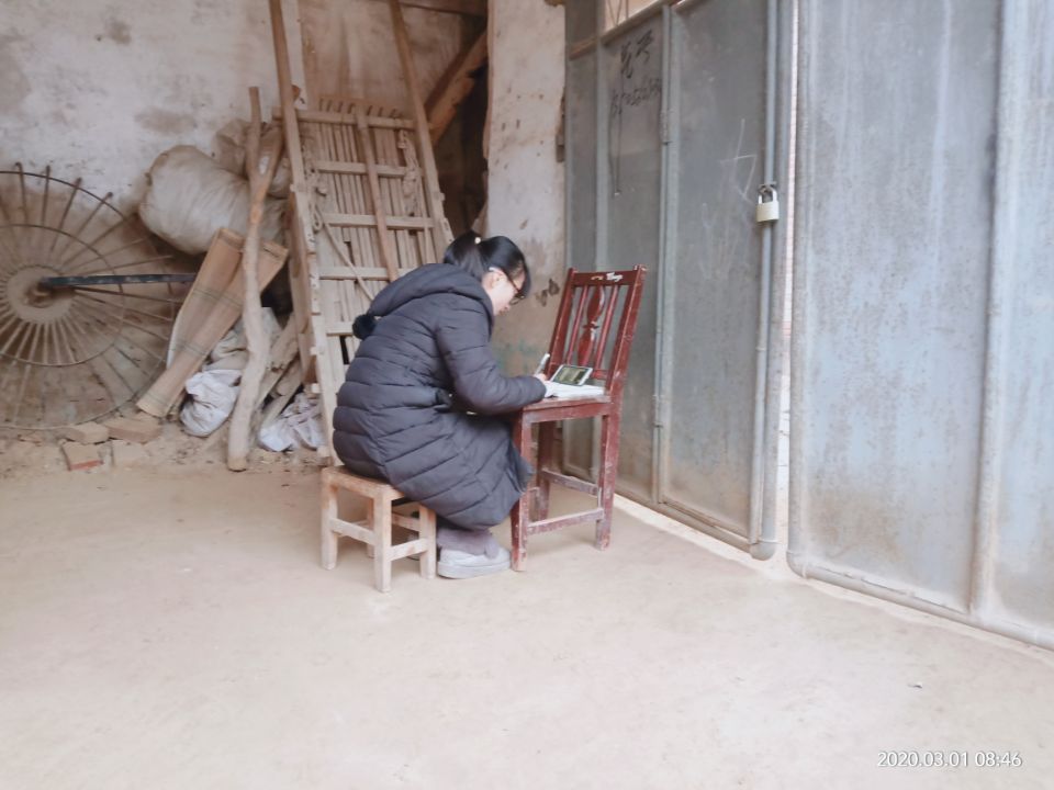 外国语学院18级商英02班的张蕊同学,在家中未装宽带的情况下坚持网课学习,为了能跟上学习进度,她在每天网络教学直播前就早早搬好凳子坐在自家大门后边,“蹭”邻居家的WiFi听课。条件有限,但她乐观地认为:这些都不是困难,外在环境的影响不能成为她前进路上的绊脚石。