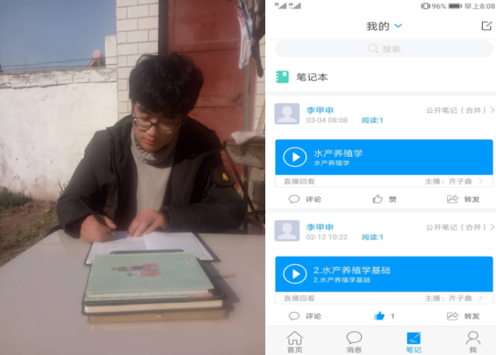 动物科技学院17级饲料班李甲申同学为了保证网课学习顺畅,不畏天气严寒,将课桌搬出房间,每天坐在自家院子中,利用手机观看各科目的直播课程,认真做好课堂笔记,直播过程中遇到网络不稳定时,他会通过一遍遍地学习PPT,反复观看直播回放巩固学习。