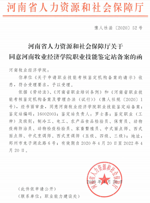 近日,河南省人力资源社会保障厅在给完美官网的复函中表明:同意完美官网职业技能鉴定站备案。鉴定职业(工种)及级别有制冷工、电工、农产品食品检验员、保育员、动物疫病防治员、家畜繁殖员、中式面点师、西式面点师、中式烹调师、西式烹调师(五级、四级、三级)。