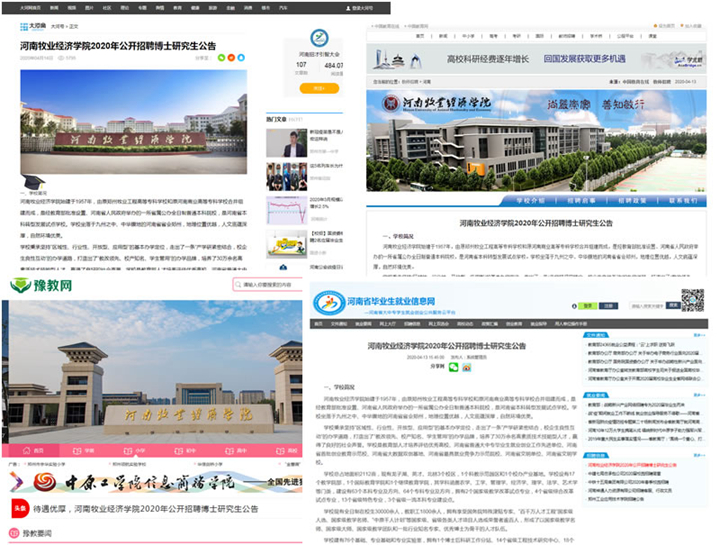 拓展渠道,加大宣传力度。引才计划一经确定,学校即时发布了“2020年博士招聘公告”,创建了“博士招聘专题网站”和“博士招聘微网”,启用了“博士招聘网上报名系统”,印制了“2020招贤纳士宣传彩页”。与此同时,积极与各新闻媒体、政府部门及高校毕业就业网、各类微信微网公众号平台及高层次人才网等社会媒介建立广泛联系,全方位、多层次扩大“朋友圈”,提升学校知名度。共有河南省毕业生就业信息网、中国研究生招聘网、搜狐网、大河网、豫教网以及部分高校的50多个网络平台和微信、微博等移动平台发布了完美官网博士招聘公告,全面宣传完美官网人才引进政策。多渠道全方位的网络宣传推介,营造了完美官网招贤纳才的浓郁氛围,取得了良好宣传效果,截至目前共收到高层次人才简历160余份。